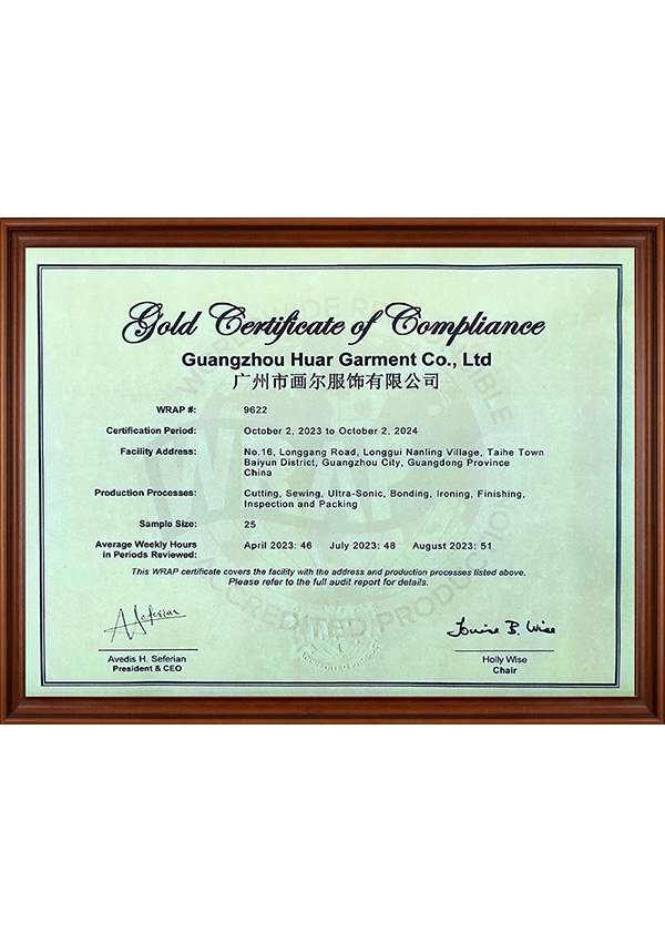 我们为所有的客户提供高品质产品和最专业的服务,同时严格遵守政府的各项法律法规,勇于承担相应的社会责任。我们拥有各种专业的资质证书:BSCI,OEKO-TEX 100 和 WRAP ,并且每年都要更新一次。我们拥有从自意大利、日本和德国进口的先进机器,包括车缝、包边无缝、刷胶和印花工艺等。